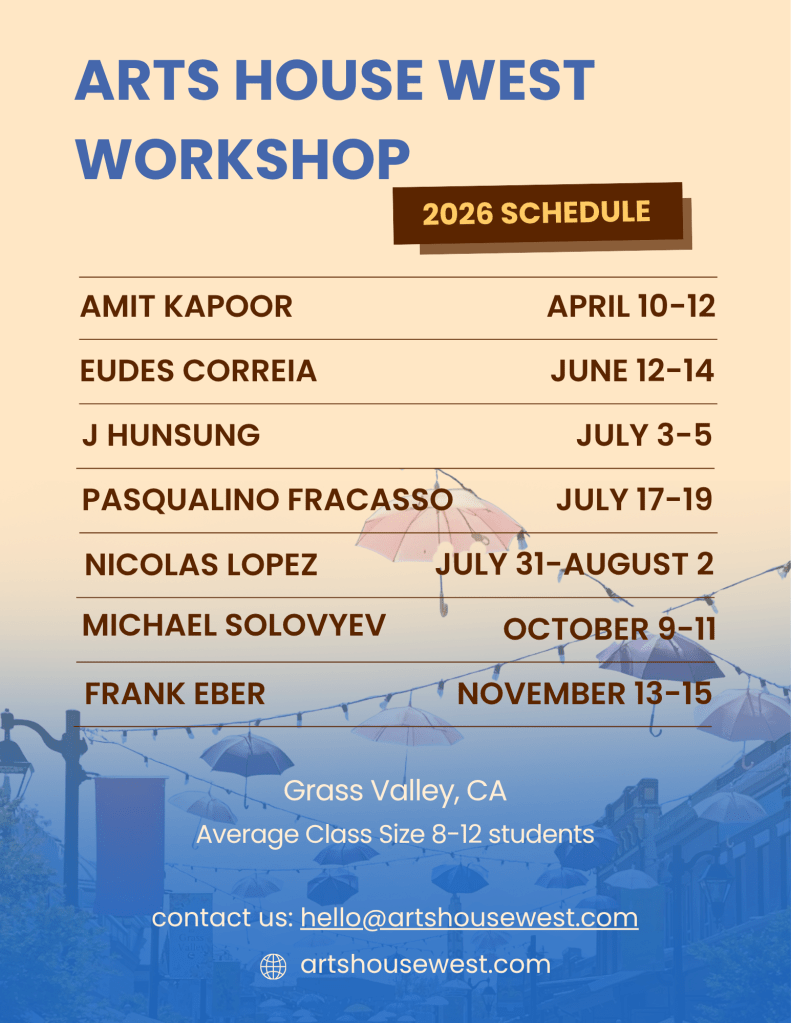 We are thrilled to introduce Arts House West, a new contemporary atelier for creativity nestled in the breathtaking Sierra foothills of California’s historic Gold Country. Surrounded by towering pines, golden light and the rich spirit of California history we are dedicated to offering world-class workshops in painting and artisan crafts all led by renowned teaching artists from around the globe.